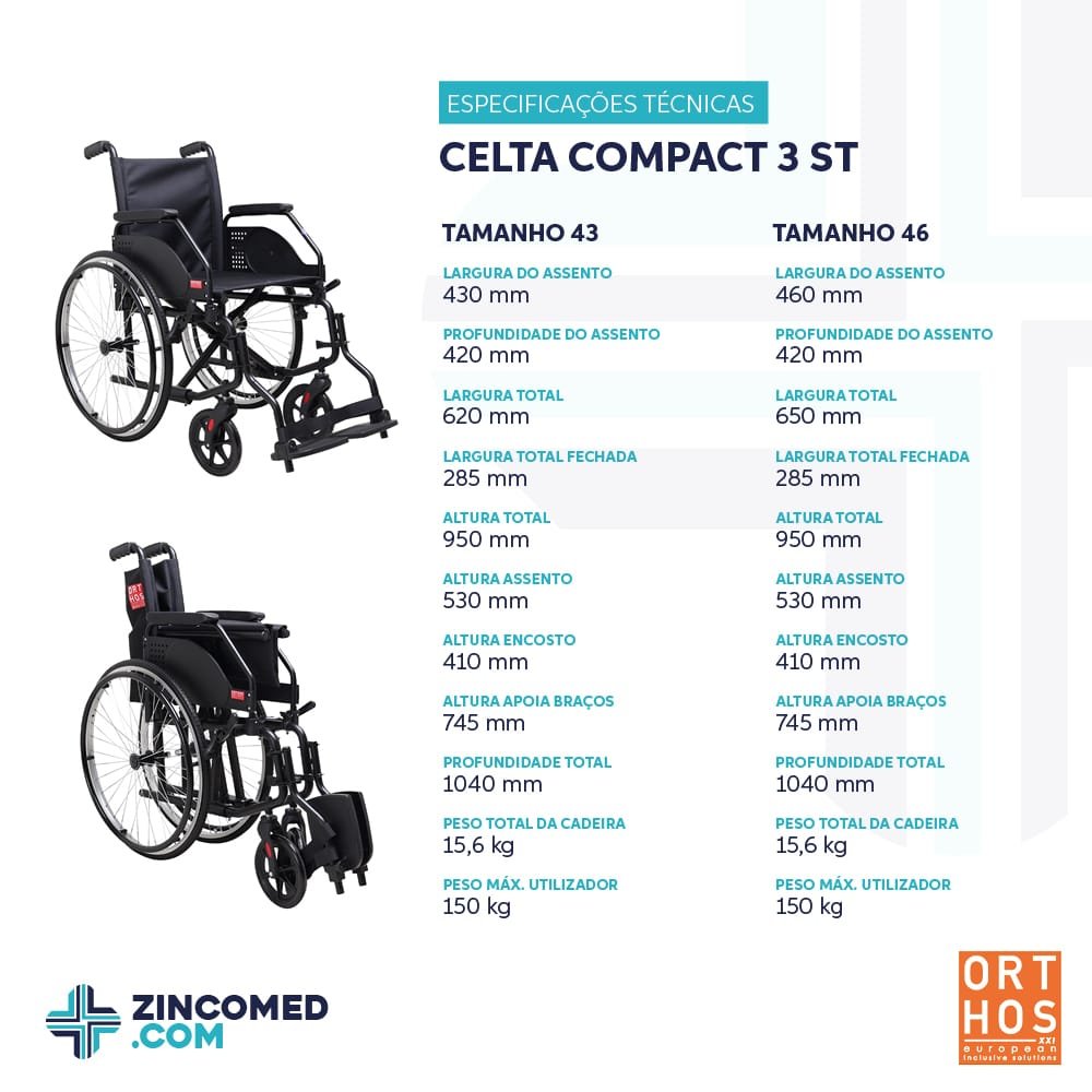 A Cadeira de Rodas Celta Compact 3 ST combina funcionalidade, resistência e design compacto para responder às necessidades de utilizadores que procuram uma solução fiável e fácil de manusear.