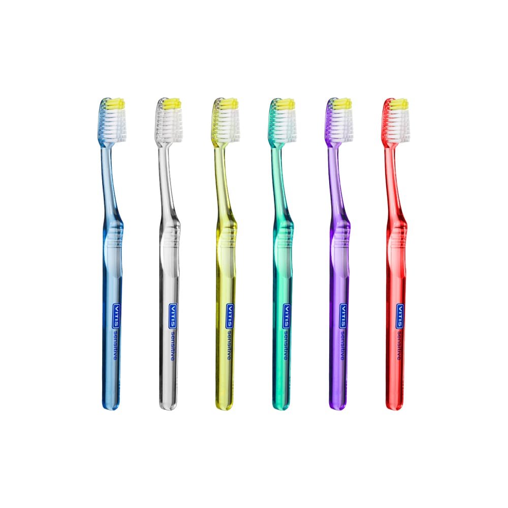Vitis Escova de Dentes Sensitive apresenta filamentos muito macios e de perfil reto, que permitem uma escovagem delicada sem provocar dor em pacientes com problemas de sensibilidade dentária ou gengivite (doença das gengivas).